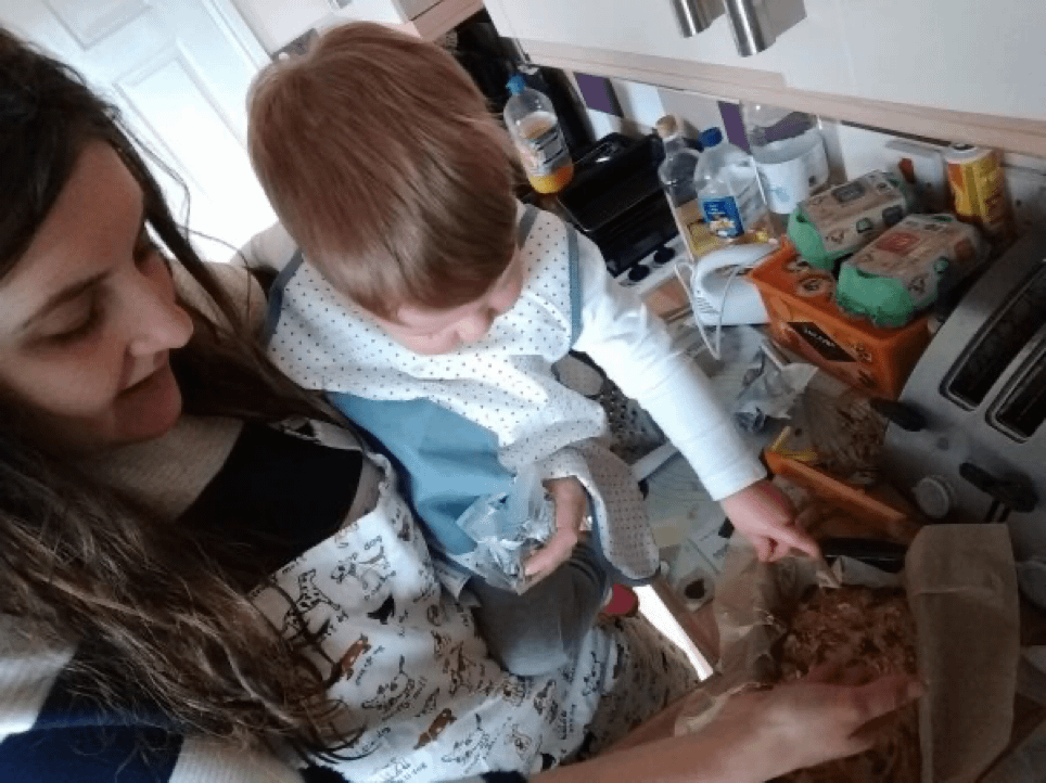 - Spend half an eternity trying to wrangle your 18-month-old into an apron. (Ignore the temptation to go ‘Nah. He’ll be fine.’ – that’s how you end up with stained clothes and an irate wifey.)