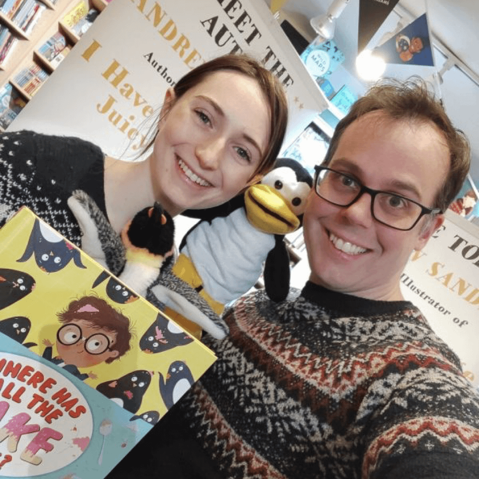 I was greeted by a wonderful young lady named Isla, who not only knows about books, but is more than happy to pause for photos with authors and penguin glove puppets. She’s even the sort of good egg that will let you joyfully take photos of her shop staircase, because frankly, when your bookshop has a floating oak and wrought iron stairs that wouldn’t look out of place in Hogwarts, how can any author NOT be allowed to photograph themselves in front of it?